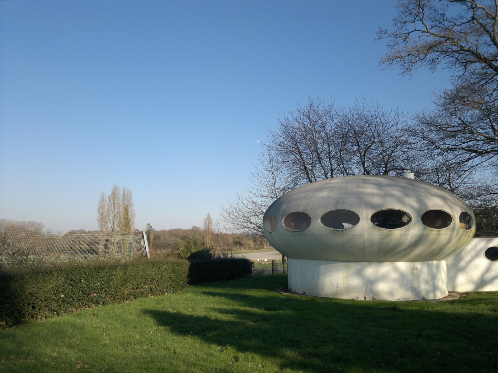 It seems that the idea that the Niedernhausen Futuro was one of the three that were located in Belgium in 1971 may be incorrect after all (see the 082314 update below). This conclusion was based on the fact that the Futuro had no lower windows. This photo, shot 021515 by futurohouse (futurohouse’s original photo can be found on Flickr here), clearly shows that this Futuro does in fact have lower windows.