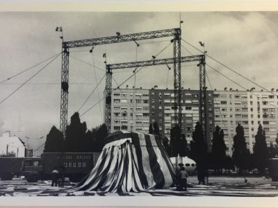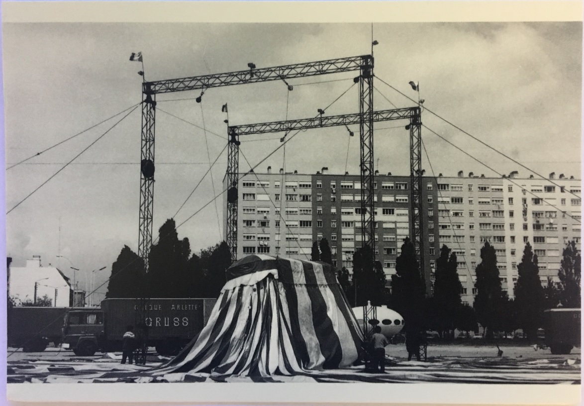 The French Cirque Arlette Gruss has been touring since 1985. This rather cool RPPC shows the «montage du chapiteau» or, according to Google Translate, the «assembly of the marquee» during a stop in Lorient, France in 1987. The photograph shows a Futuro behind the marquee.
