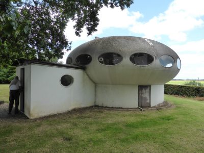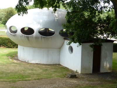 On 073014 Yves Buysse visited the Ploemeur Futuro. Not only was Yves able to see the Futuro’s exterior he was also given the opportunity to go inside the unit. Yves tells us the Futuro appeared to be in reasonable condition, though the original windows were gone and had been replaced by what appeared to be flat Acrylic sheets. Yves shot a nice set of photos of the Futuro and these can be seen below. For shots of other Futuros Yves has visited check out Flickr where Yves goes by the nickname futu