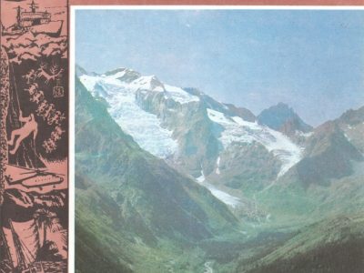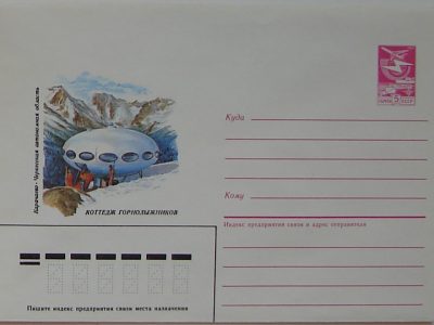 The photos below are of a print that combines photos of this Futuro and a skiing scene into a single photo. The text on the rear (according to Google Translate) identifies the Futuro as a «tourist hut» and places it «In the mountains of Karachay-Cherkessia». The copyright line dates to 1983. It is unclear if this is the date of the original photo(s), the date of production of the combined print or both.