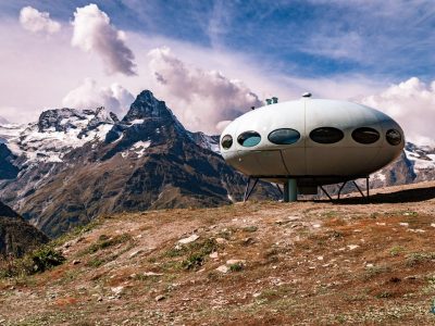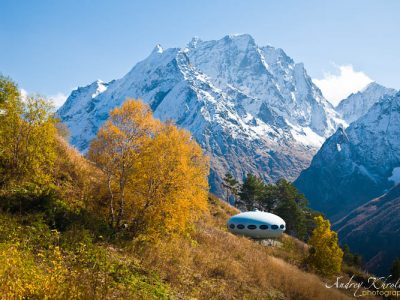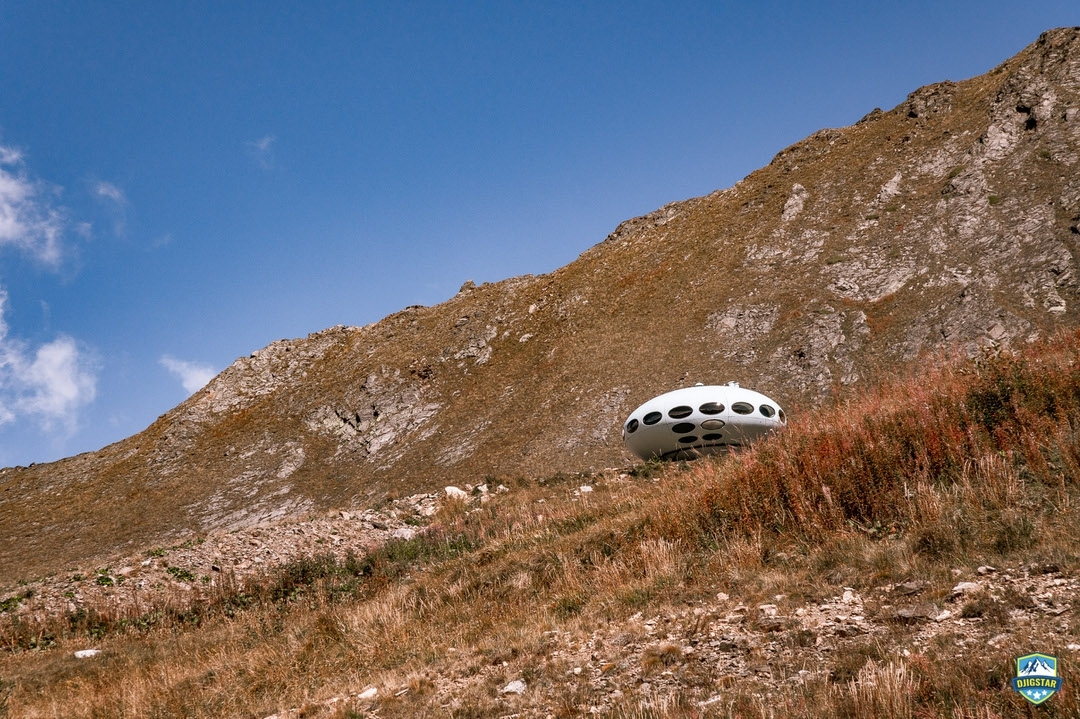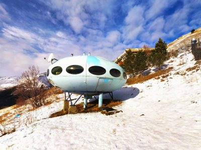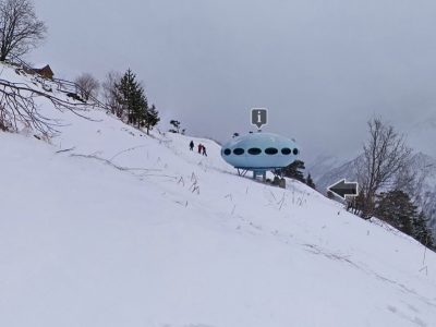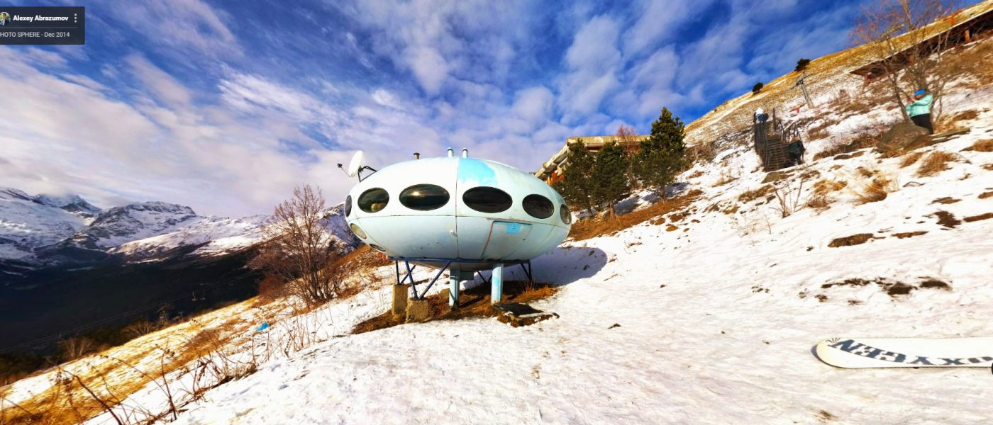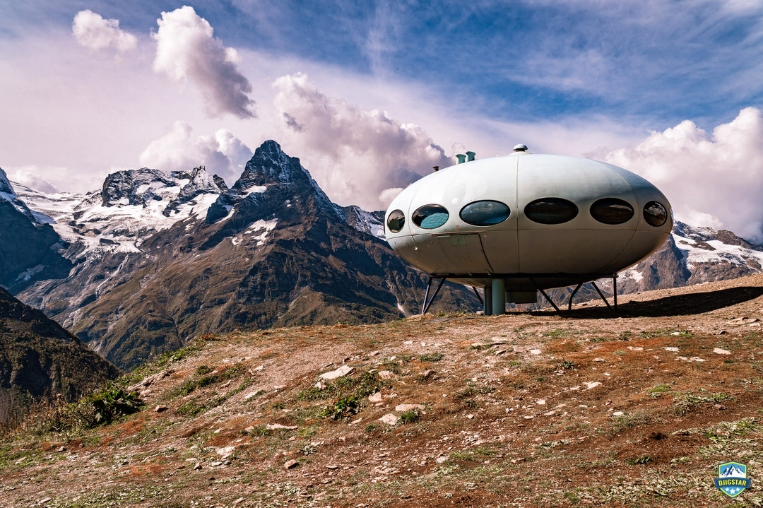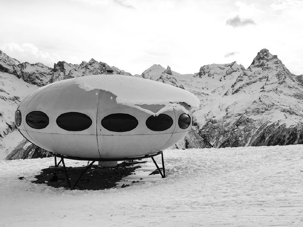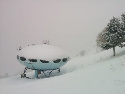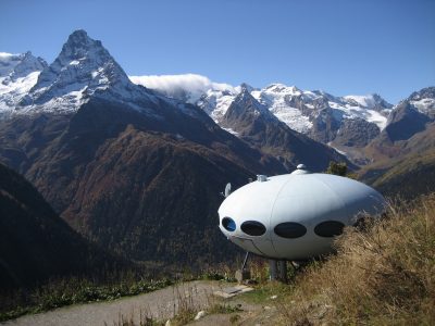 The Hotel Tarelka is located in Dombai, Russia high in the Caucasus Mountains and is home to a Futuro. Given that the original idea behind the Futuro was for it to be used as a ski-cabin the Futuro in Dombai is probably the only remaining example with a use that, while not exactly as intended, is pretty close to that originally envisioned by Matti Suuronen back in 1968.