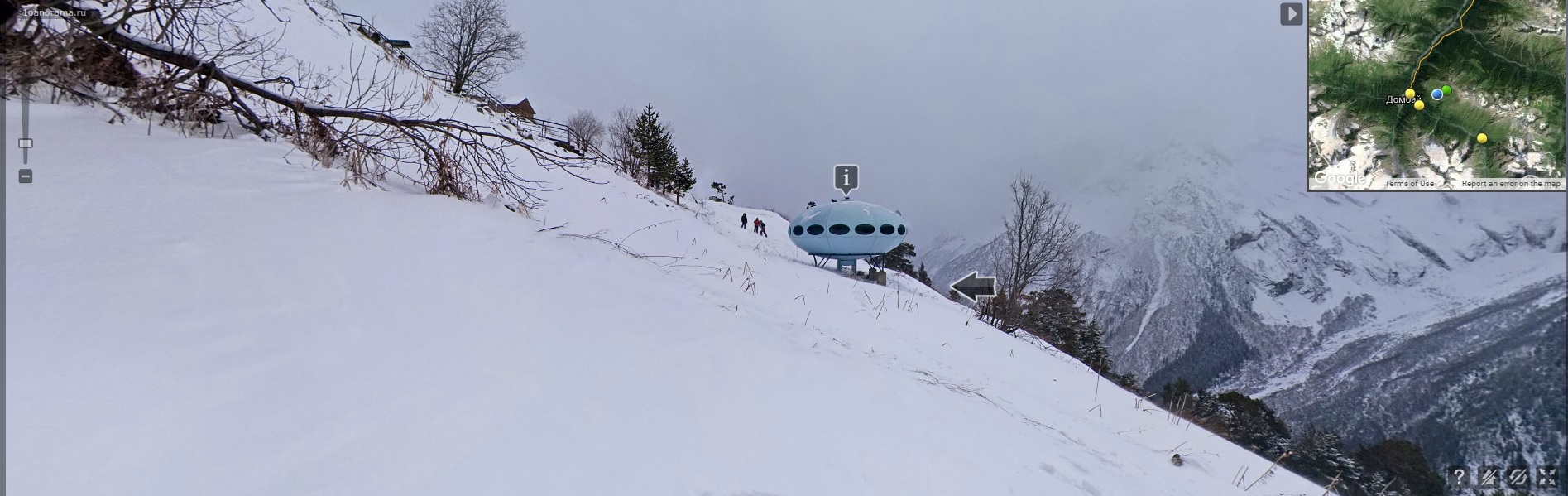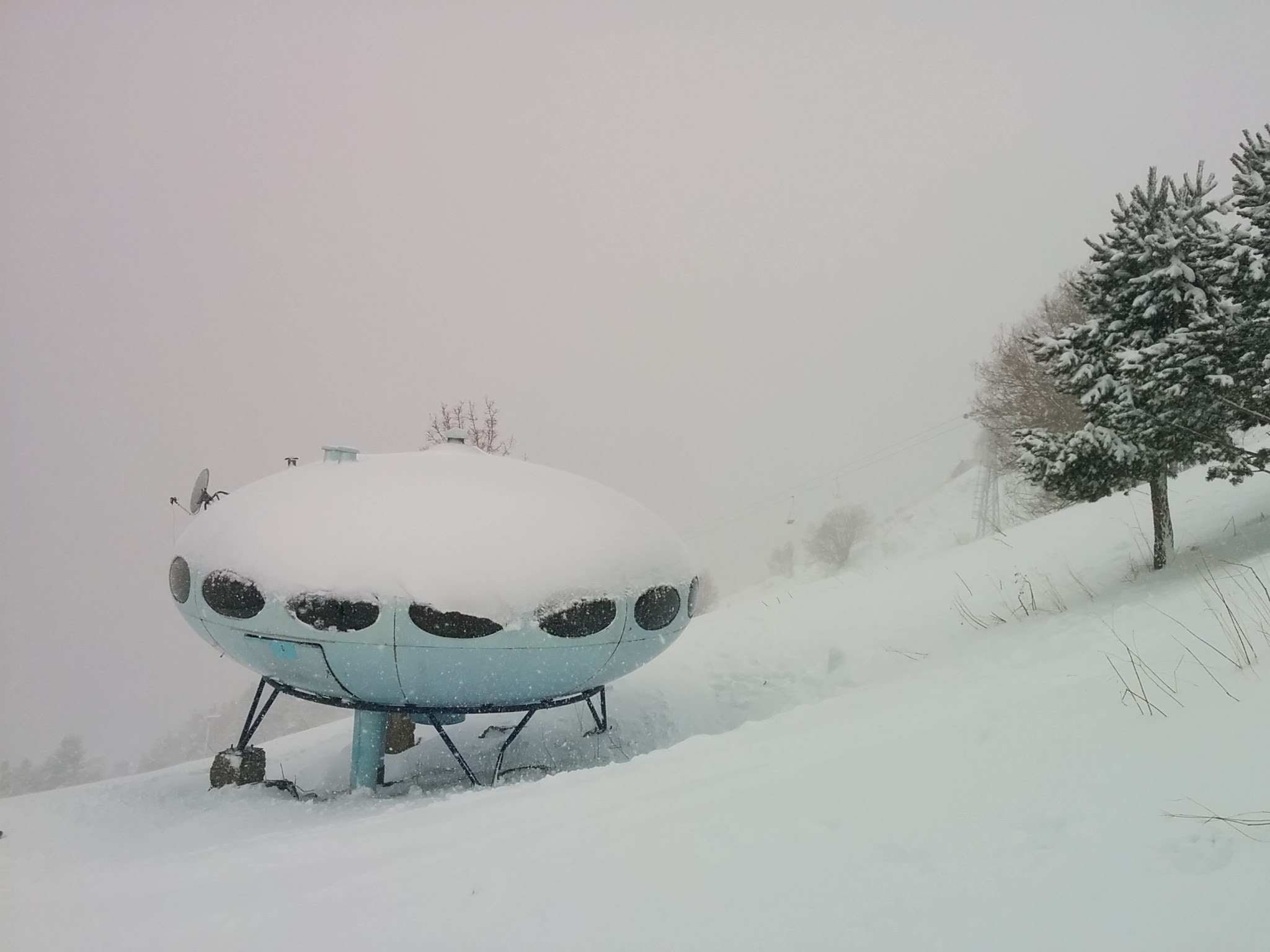 Never seen a view of this Futuro that looks remotely like this; looking at the aerial imagery in Google Maps and Google Earth there were some buildings close to the Futuro at the old location but none of the photos suggest this location so we are assuming this is a photo shot at the new location a little further up the mountain 032517.