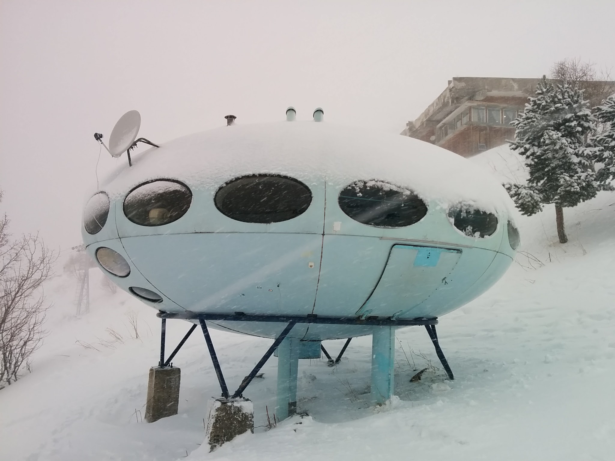 Dmitry Yakubovskiy posted the two photos below to Instagram which show the Futuro at its new location a little further up the mountain. Looking at the photos this location appears to be flatter than the previous location. Dmitry’s original images can be found on Instagram here and here. Links to the two videos below, which also show the Futuro in its new location, were posted to our Facebook Page yesterday; thanks for the «heads up» Yves. The first, from Russian TV station 袗褉褏褘蟹 24, includes foo