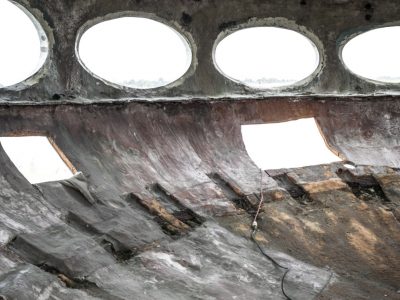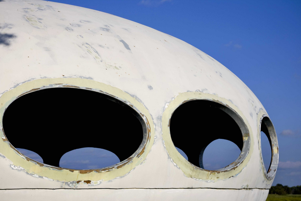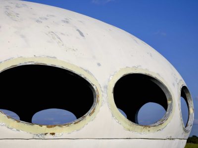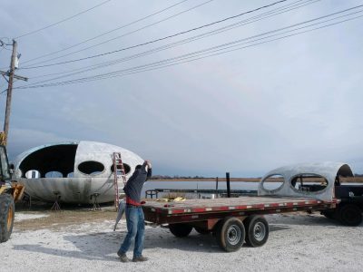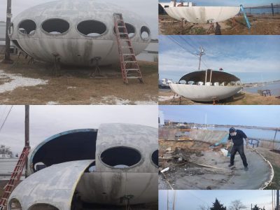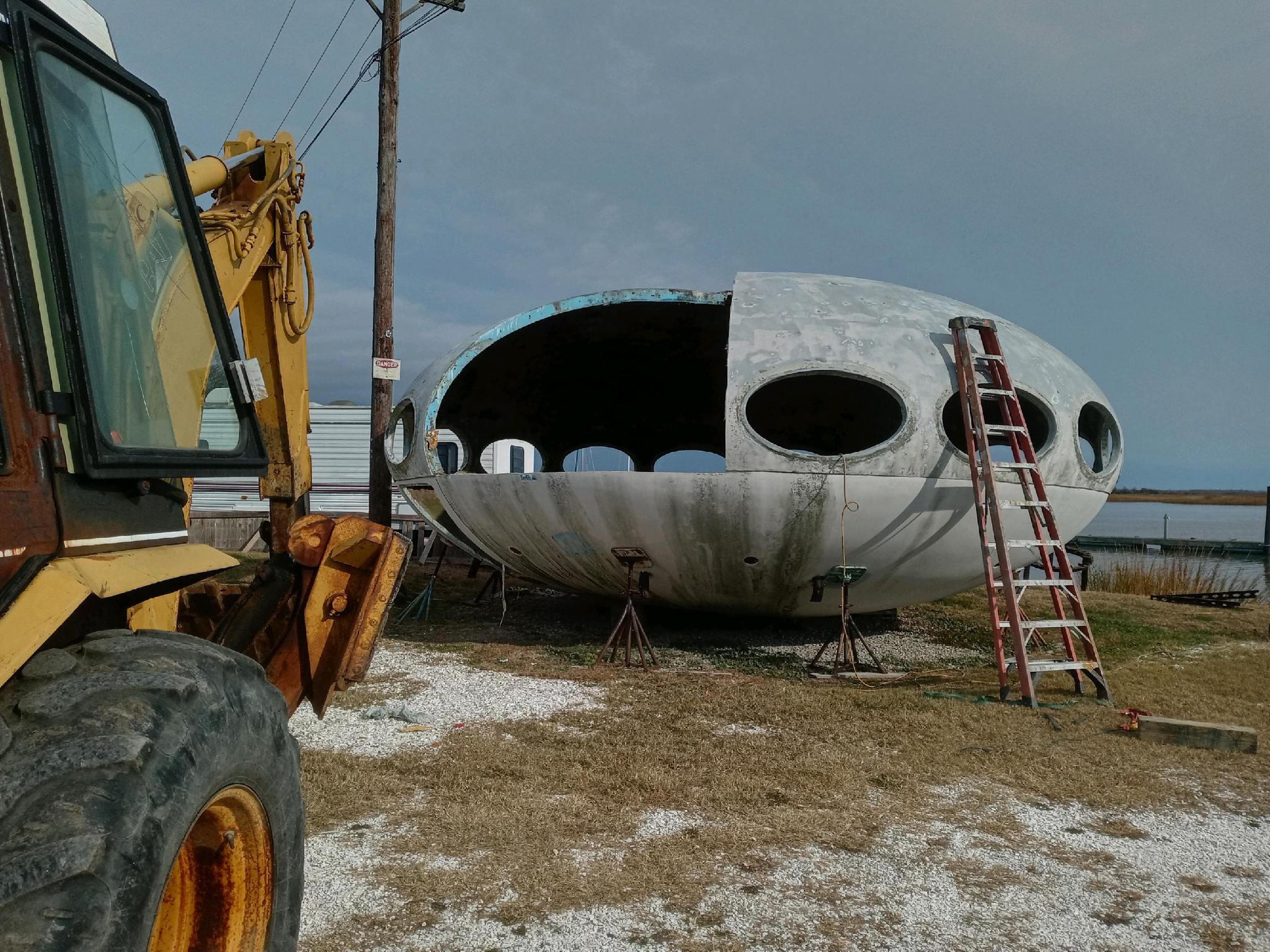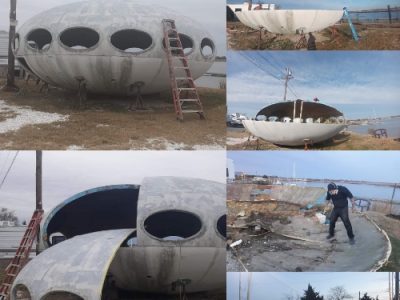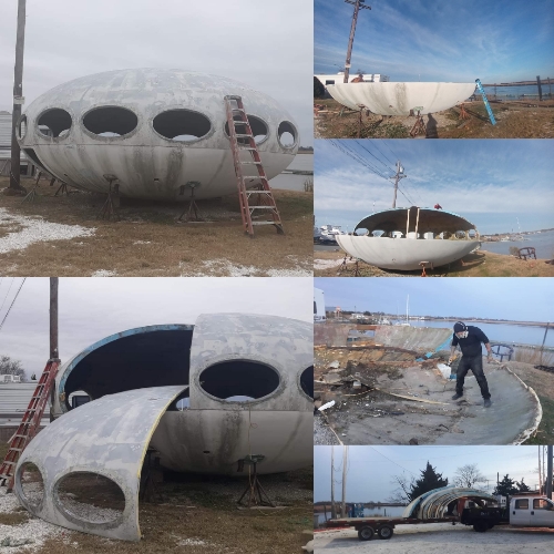 The Futuro has been purchased and relocated; the photos below show a small part of the process of disassembly prior to removal from the location. The Futuro is going to undergo a major restoration effort and it will also be used to create molds as the basis for remanufacturing Futuros.