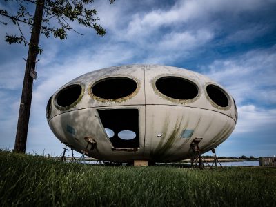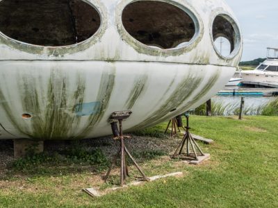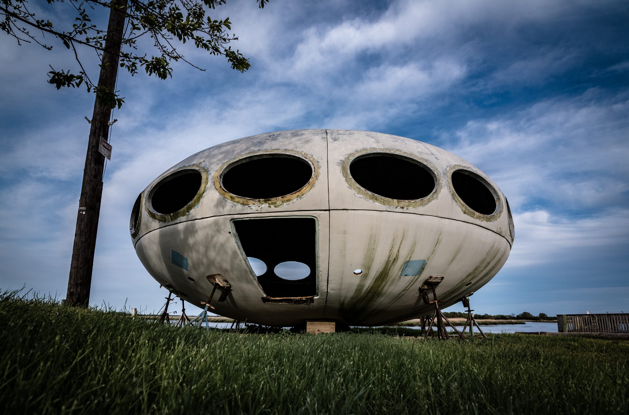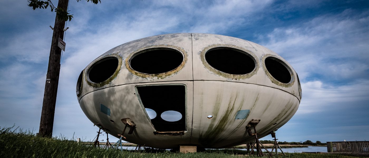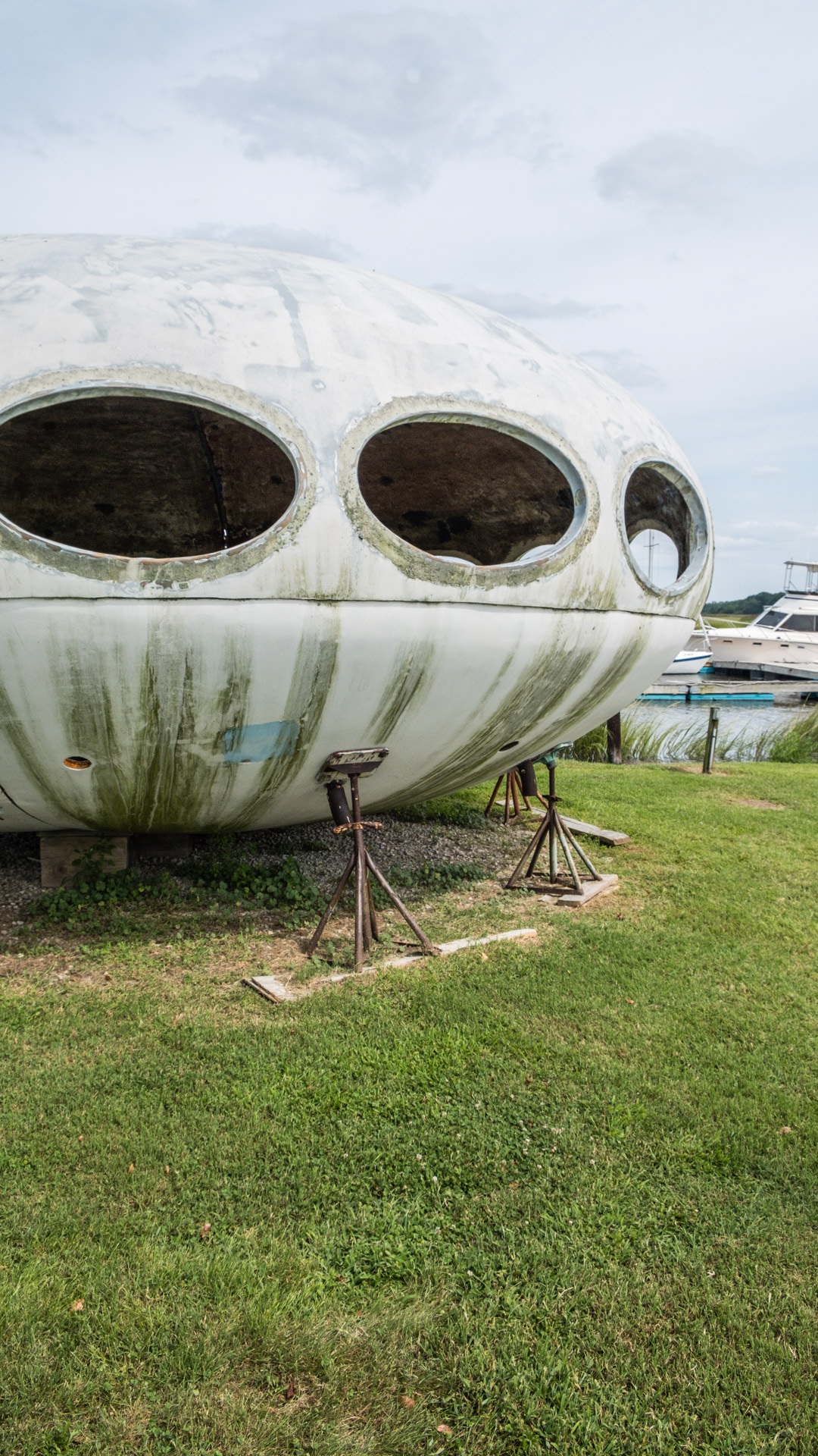 This Futuro House spent it’s early years as an amusement ride at Morey’s Pier in Wildwood, New Jersey. We have no idea whether it went straight from manufacturing to the «pier» or if it «lived» somewhere else in between but with video available of it in action on the pier in 1974 it could certainly not have been that old at the time it arrived at Morey’s.