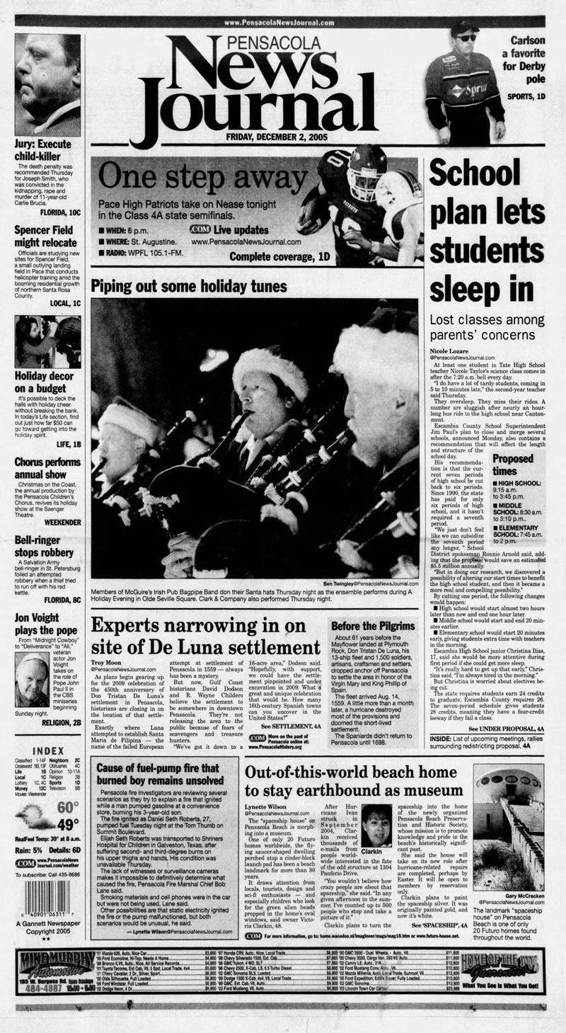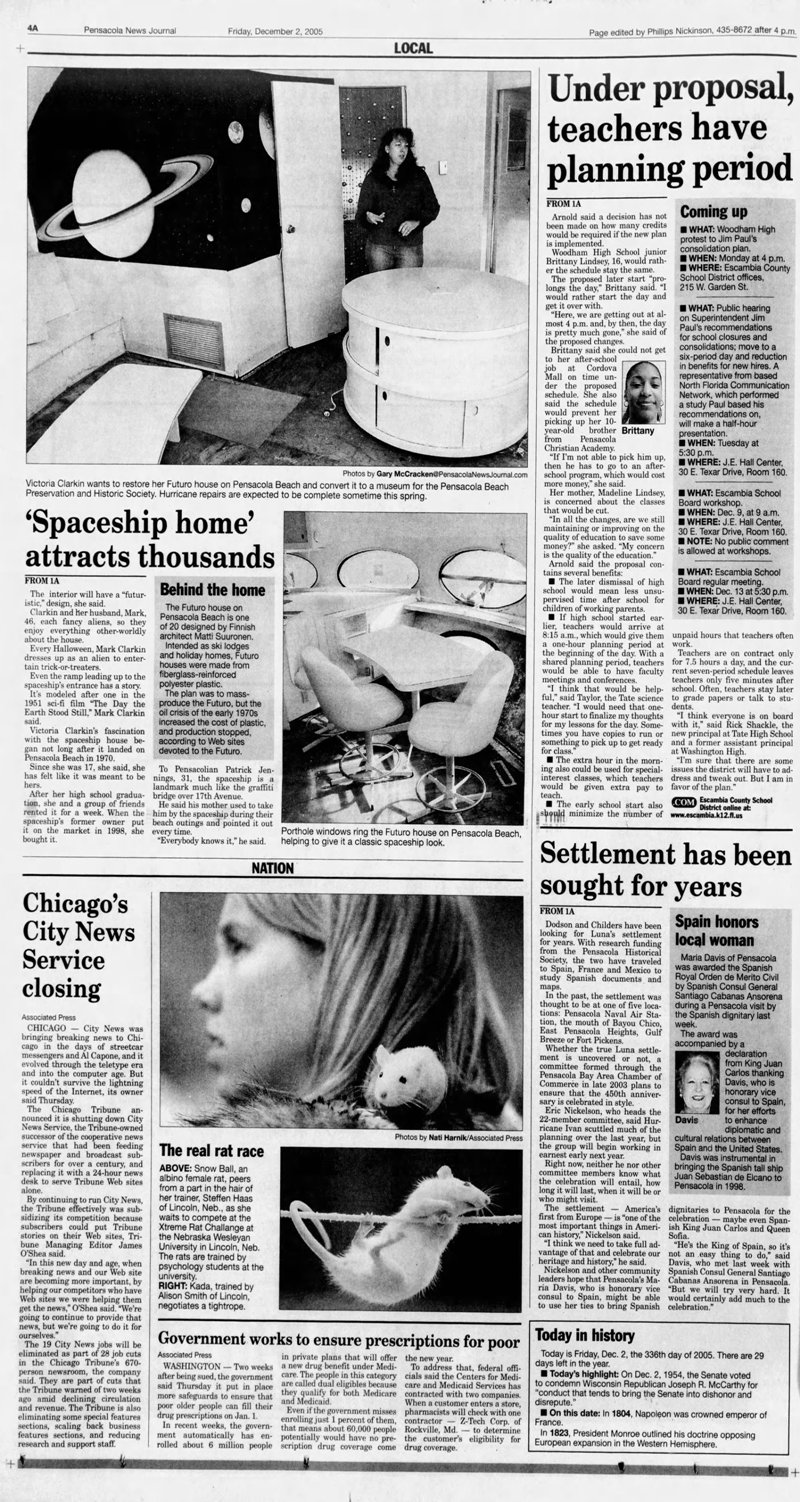 Florida based daily morning newspaper the Pensacola News Journal traces its heritage back to 1889 according to Wikipedia. The 120205 issue includes an article on this Futuro and its owner Victoria Clarkin.