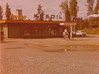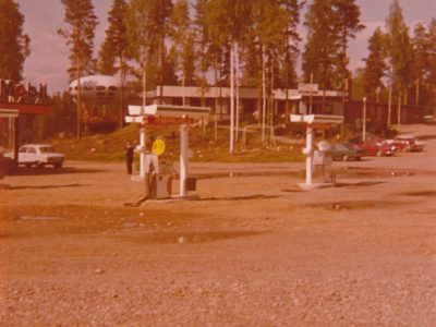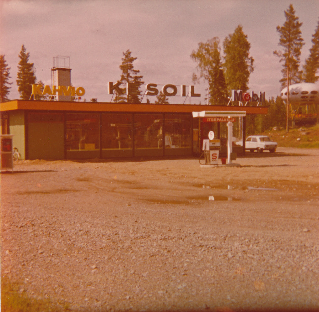 «The picture shows the Kuhmooinen Rauhamäki motel in full swing. Gas station still at Kesoil in Rantanen. Futuro cabinet also in place. Photo on the front cover of the motel flyer.»