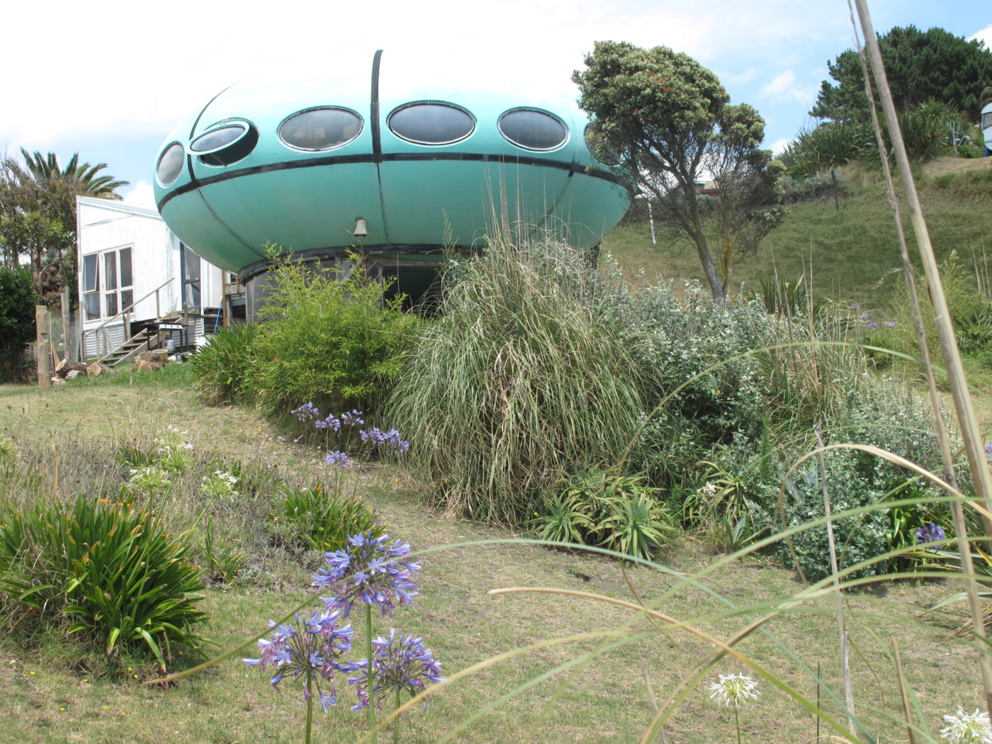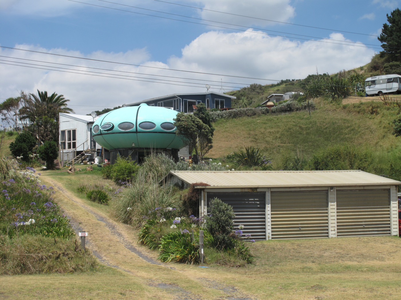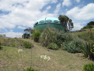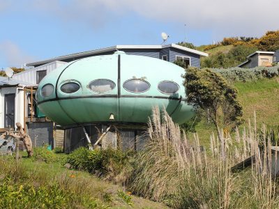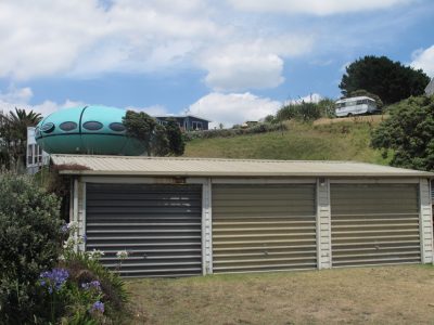 A 2013 article on stuff.co.nz told us that this Futuro had been moved to Raglan from Tauranga (via Whangaparaoa). Until now we had not seen a photo of the Futuro at that location nor known its precise location.