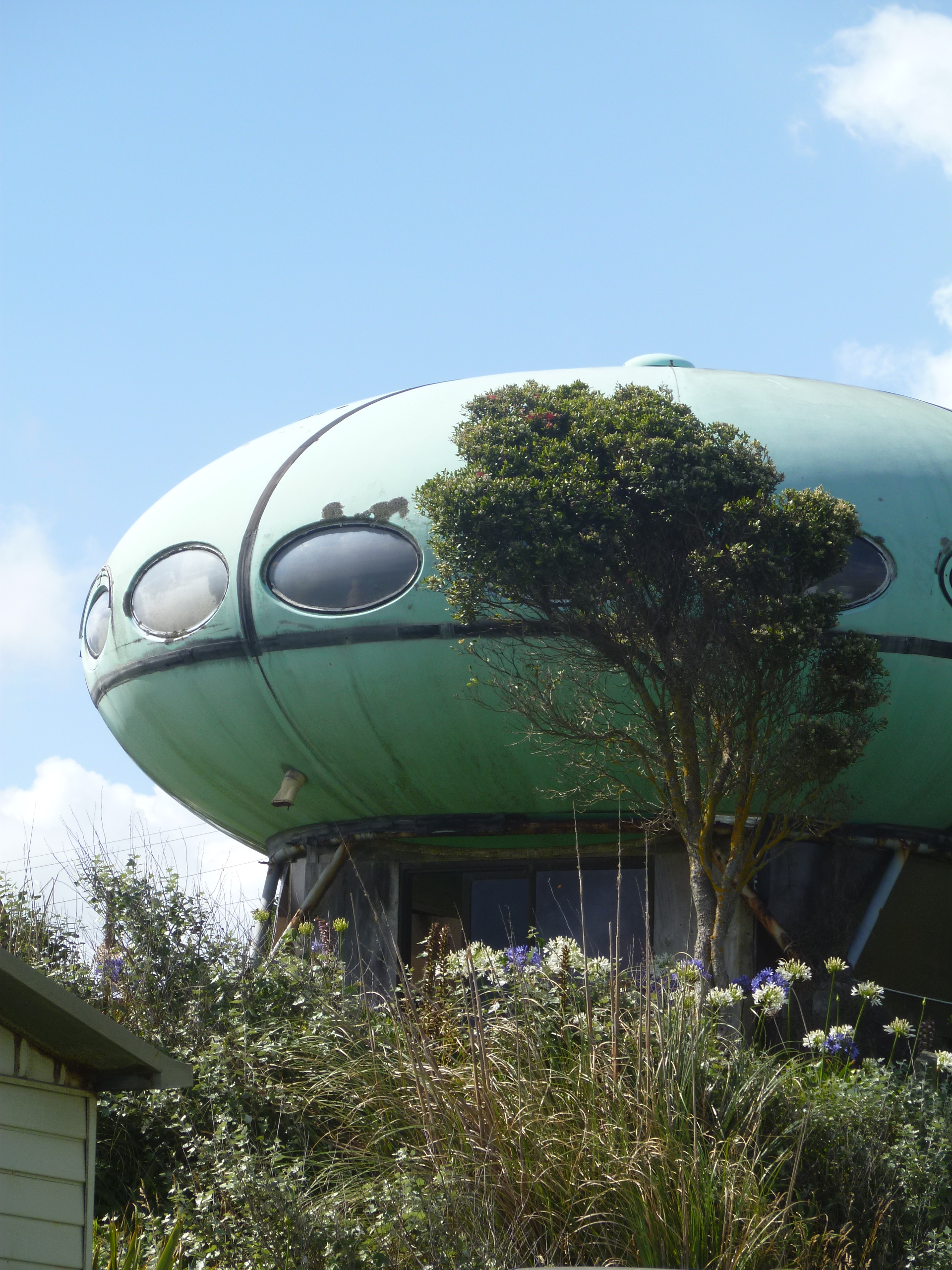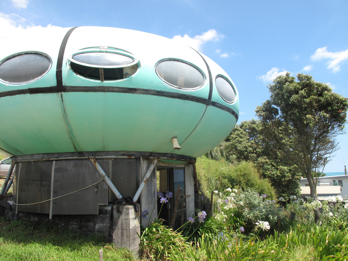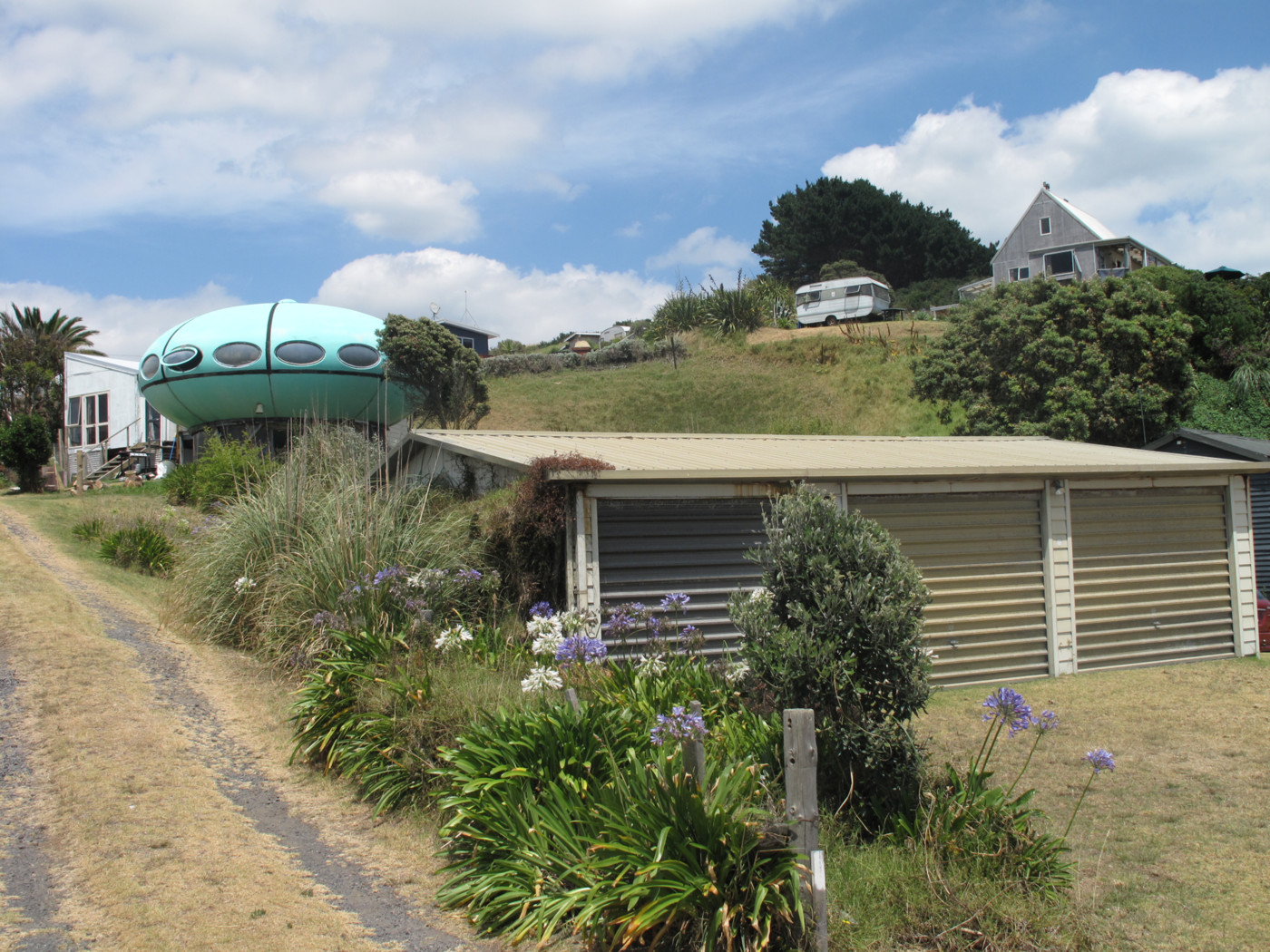 A 2013 article on stuff.co.nz told us that this Futuro had been moved to Raglan from Tauranga (via Whangaparaoa). Until now we had not seen a photo of the Futuro at that location nor known its precise location.