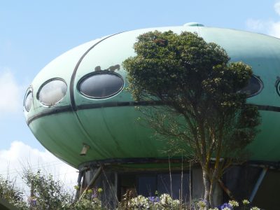 The Futuro at Raglan, New Zealand is owned by a retired ship’s captain who bought it on the spot when his ship berthed one day and he saw the Futuro. The Captain had it located at Whangaparaoa for several years but on his retirement relocated it to its current home in Raglan. The Futuro is seated on a concrete base though the standard steel support frame is also visible and it appears to be in excellent condition and still in use.