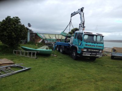 The small photo top left shows the Futuro on its arrival in Raglan back around 1984 being hoisted into position by crane; to be honest we thought we had seen this photo and added it to this site long ago but it seems not so here it is — thanks Tim.