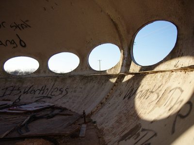 The Royse City Futuro is our «local» Futuro; it sits a little under 60 miles from our home or about an hour one way. With a few days away from the «day job» for Thanksgiving we decided it was time for another visit so 112519 we took the short trip out to Royse City. The two photos below show the Futuro as it appeared that day. It was nice to see that the exterior was still graffiti free. Not so the interior as can be seen in this photo. During this visit we did come across one very interesting a