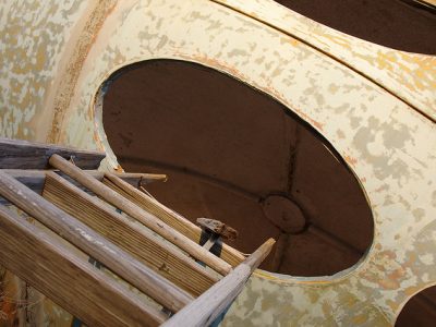 As can be seen in the photo and the video below the framed wooden «entry chamber» like structure inside this Futuro has now been completely demolished. The photo is by Steve Rainwater and the video was posted to Youtube by Scott J.