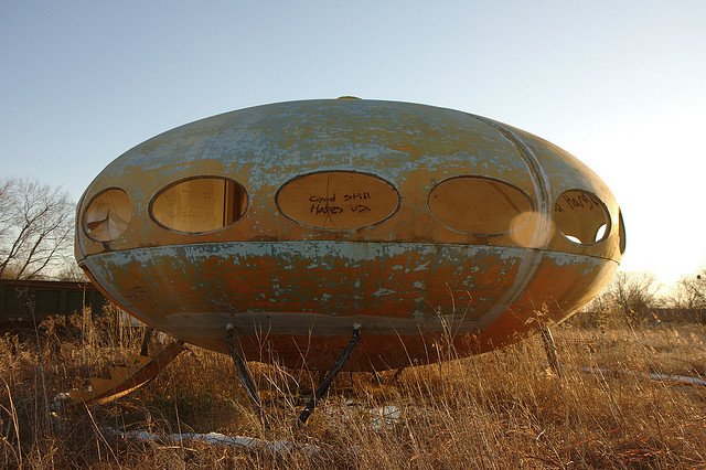A recent picture taken 031713 by Molly Block confirms that the Royse City Futuro is still on site. It’s condition appears to be pretty much unchanged although someone has stood up the steps since I was there in September 2011. Thanks for the photo Molly.