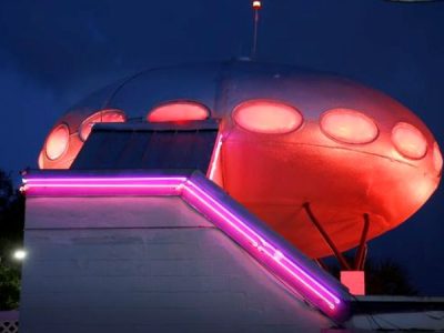 We have come across quite a few videos over the years that include footage of this Futuro but they have always also included some footage related to the adult nature of the busines that made them unsuitable for use on this site. Recently however Richard captured the footage below and kindly shared it with us. Certainly has some «active» lighting to go along with whatever happens «behind closed doors».