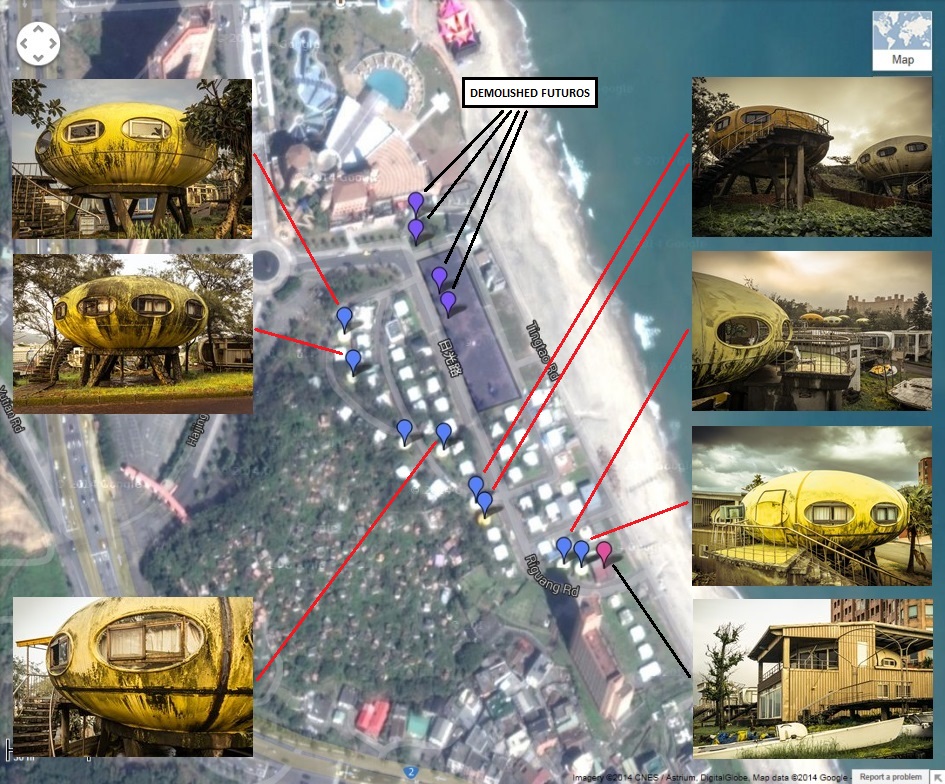 Though there are a few examples of two Futuros located on a single site (Kvistgård, Carlisle, Huntsbury) almost all of the remaining Futuros are located one to a site. The one major exception is Wanli in New Tapai City on the Northern coast of Taiwan where there are no fewer than 13 Futuros along with a much larger number of Venturos. Though this is the largest concentration of Futuros known there appears to be very little information on the web (at least that we can find) about how or why the c